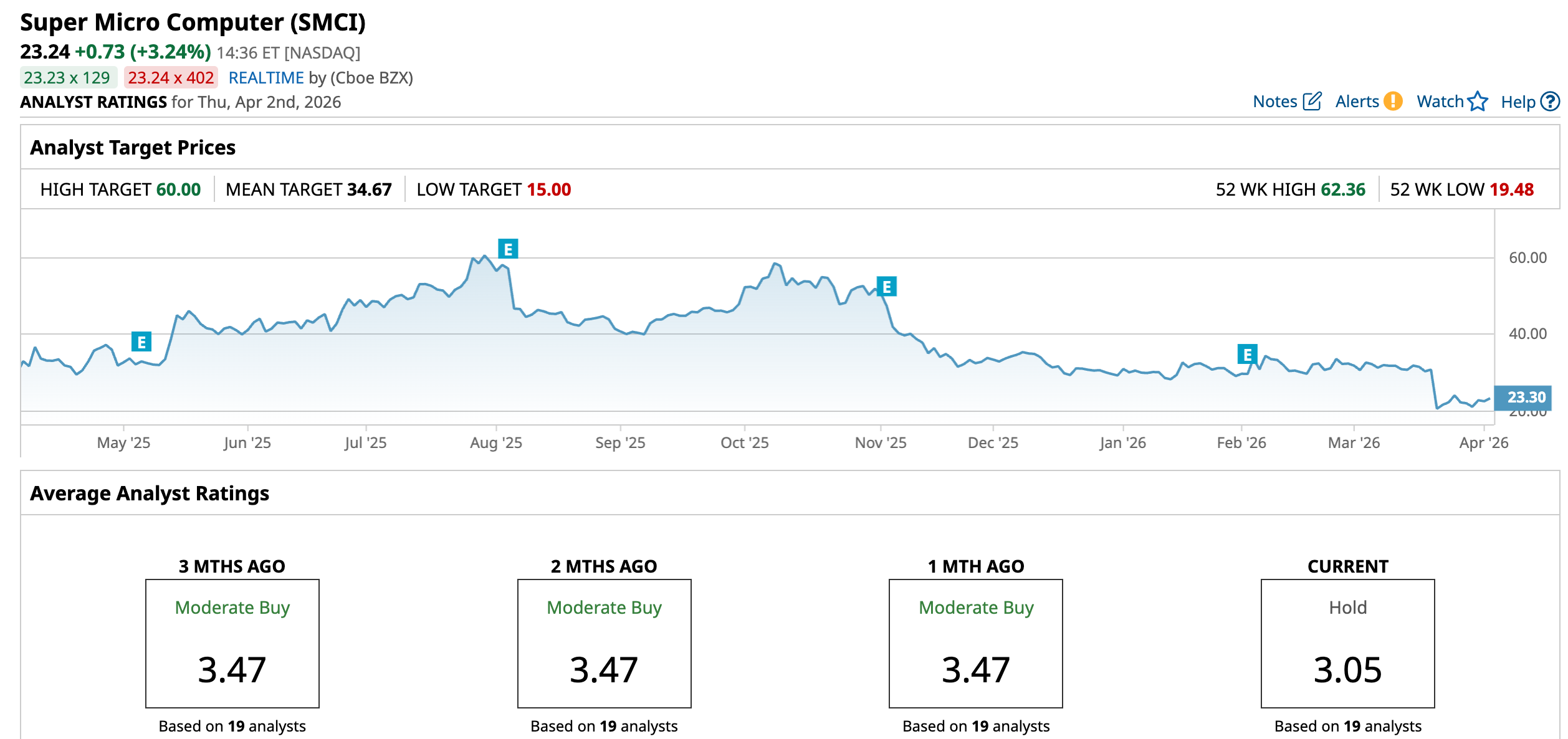 Overall, SMCI stock carries an overall rating of “Hold.” Out of 19 analysts covering the stock, three rate it a “Strong Buy,” two a “Moderate Buy,” 10 suggest “Hold,” one leans “Moderate Sell,” and three flag “Strong Sell.”