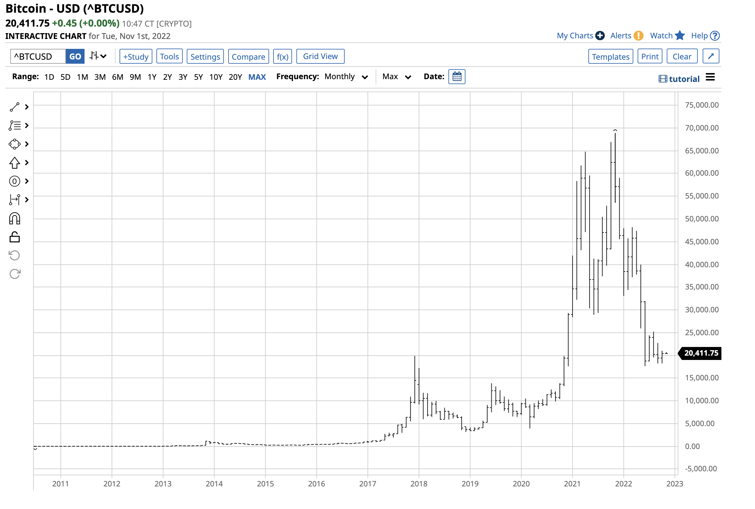 The chart highlights the decline that took the top cryptocurrency to a low of $17,614.34 in June 2022. Since the 74.4% drop, Bitcoin has traded in a range between the June low and $25,198.76. At around $20,400 on November 2, Bitcoin was near the middle of its trading range. The current consolidation period could be a positive, given Bitcoin’s price history.Â