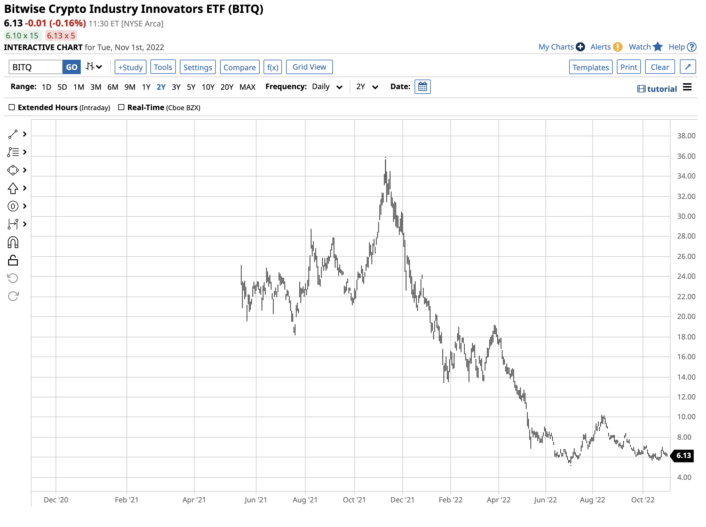 The chart shows BITQ rose to a high of $35.68 per share in November 2021 when Bitcoin and Ethereum prices peaked. It fell to $5.39 in early June, just after the leading cryptos reached the most recent lows, a decline of 84.9%. Â If the crypto winter gives way to another explosive rally, BITQ will likely soar.Â