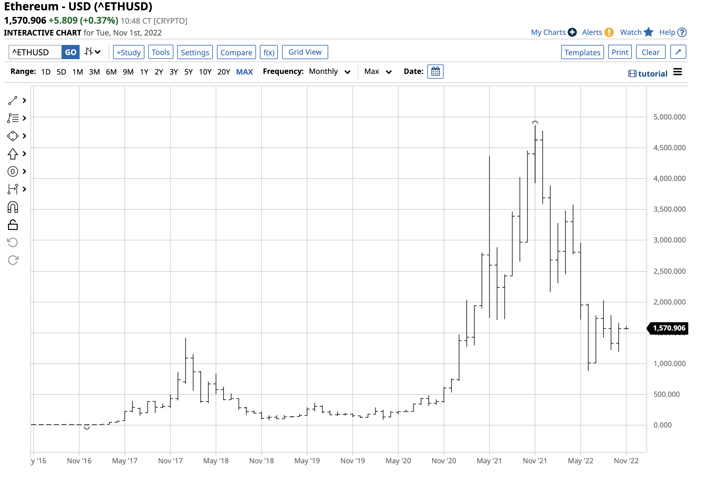 Ethereum reached its record high of $4,865.426 in November 2021.Â