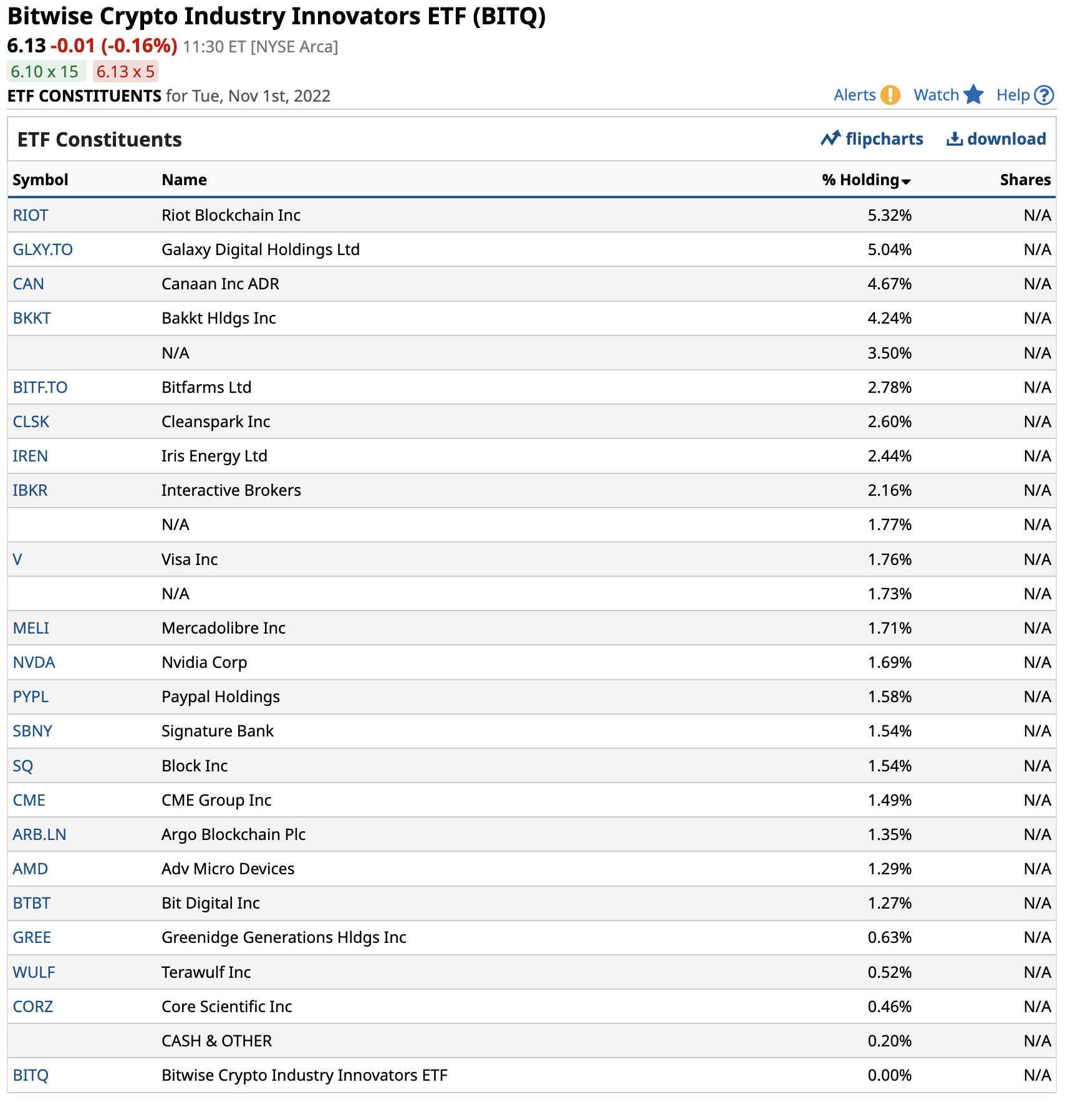 The Bitwise Crypto Industry Innovators ETF (BITQ) is a new product that will likely move higher and lower with Bitcoin and Ethereum prices. At $6.13 per share, BITQ had $62.628 million in assets under management. The ETF trades an average of 130,554 shares daily and charges an 0.85% management fee. The top holdings include: