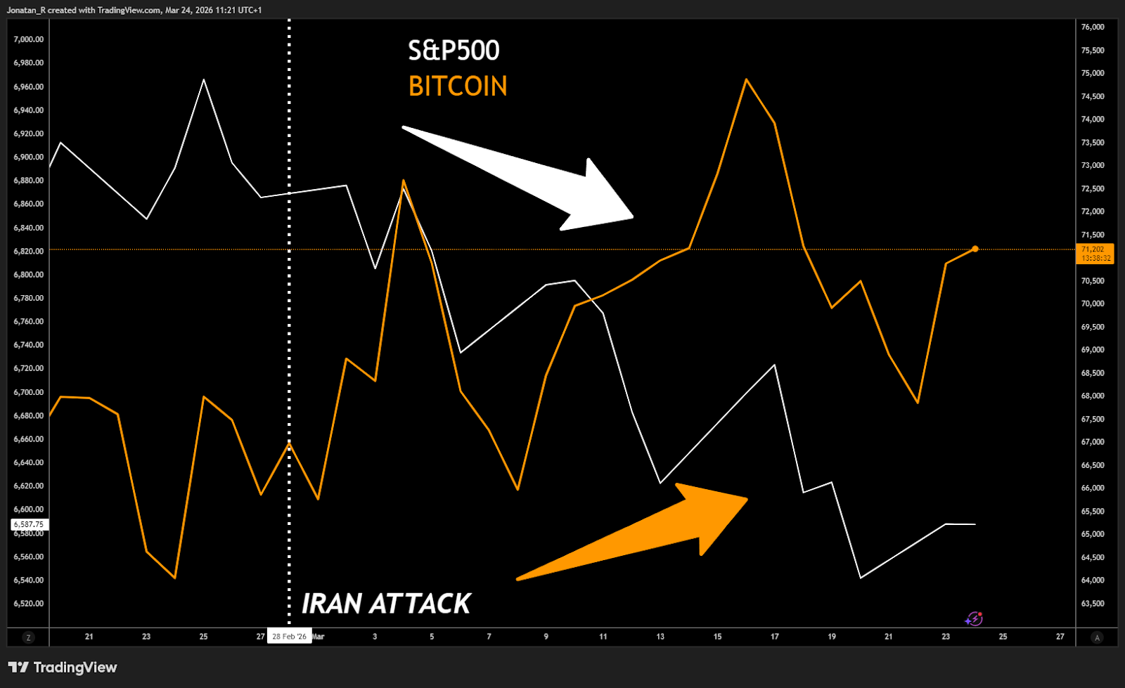 De-escalation: The Strait of Hormuz reopens, Brent crude retreats toward $80 to $85 per barrel, and the inflation premium begins to unwind. In this scenario, the S&P 500 could retest the 6,731 to 6,782 resistance zone, with a break above it opening the path toward a more sustained recovery. Bitcoin could push back above $75,000 as rate cut expectations revive and the risk-on bid returns to digital assets. This is broadly what markets began pricing on 23 March after reports of productive US-Iran talks, with the S&P 500 surging over 2% and Bitcoin reclaiming $71,000.