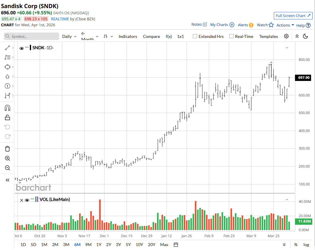SNDK stock has returned 1,371% over the last 12 months, mainly due to restricted supply and massive demand for memory products because of AI workloads. However, the stock saw a drawdown in March, which is what created the recent buying opportunity.