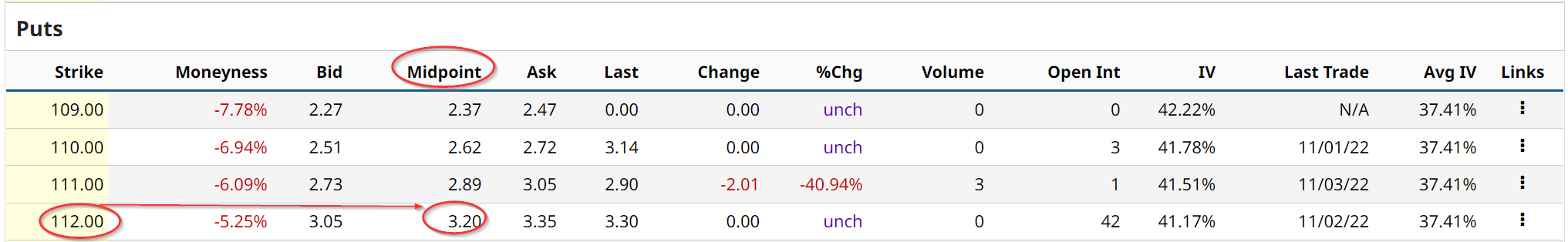 Moreover, some investors like to sell OTM puts that are covered by cash put up with the brokerage firm in order to make more income. For example, the $112.00 strike price puts for the same expiration offer an even higher premium of $3.20.