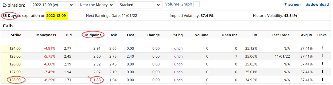 That implies that the covered call investor can make 1.55% by selling call options at that level, for expiration 35 days from now (i.e., $1.83/$118.20 stock price). This means that if the stock rises by 8.29% from $118.20 to $128.00, the covered call investor will be able to keep that gain when his shares are exercised at $128. So the total gain will be 8.29% + 1.55% or 9.84%, almost 10% in one month. Even if the stock does not rise as high as $128 by Dec. 9, the investor keeps the gain in his underlying shares, plus the $1.83 received from the sale of the covered calls contract. That is a decent deal for most investors.