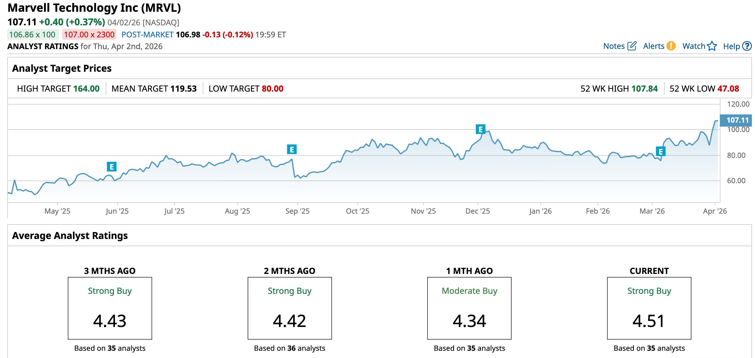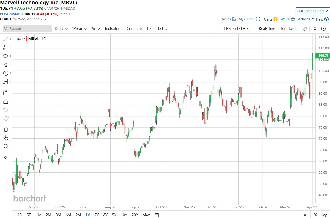 MRVL trades at $107.11 as of April 2, up 26% YTD and 69.4% over the past 52 weeks.