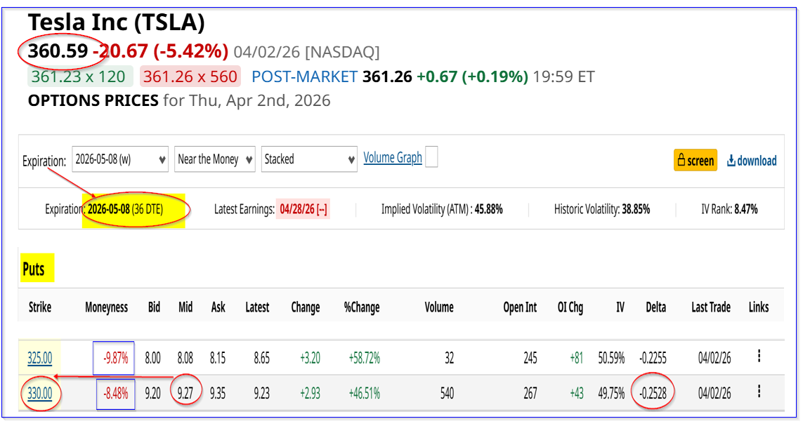 For example, the May 8 option expiry period shows that the $330 put strike price, almost 8.5% lower, has a midpoint premium of $9.27. That provides a short-put yield of 2.81% (i.e., $9.27/$330.00 = 0.02898).