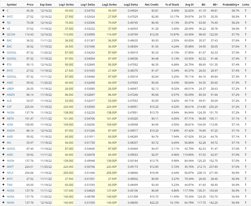The screener shows some interesting short straddle trades on popular stocks such as C, INTC, TJX, VZ, QCOM, BAC, GOOGL, RTX , AMD, UBER, AMZN, SLB, CAT, NVDA, META, XOM, MU, NVDA and NFLX.
