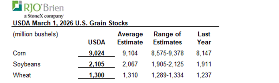 Grain markets followed the swings in crude oil as well as the fresh data provided by the USDA Prospective Plantings and Grain Stock reports released on Tuesday, March 31st at 11 AM CDT. USDA March 1st US corn stocks came in at 9.024 billion bushel versus expectations at 9.104 billion bushels average trade guesses and above last year’s 8.147 billion bushels. US soybean stocks came in at 2.105 billion bushels versus average trade guesses of 2.067 billion bushels versus last year’s 1.911 billion bushels. Wheat ending stocks came in at 1.30 billion bushels versus average trade guesses of 1.31 billion bushels versus last year’s 1.237 billion bushels. Â