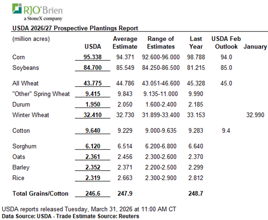 The acre numbers held more surprises with corn coming in at 95.338 million acres versus 94.371 million acres and last year’s 98.788 million acres. The USDA’s February Outlook guesstimate was 94.0 million acres. US soybean acres came in at 84.70 million acres versus expectations of 85.549 million acres and last year’s 81.215 million acres. The USDA’s February Outlook was 85.0 million acres. The all wheat class acreage number was 43.775 million acres versus average trade guesses 44.789 million acres. The winter wheat acreage number was 32.410 million acres versus average trade guesses of 32.730 million acres and last year’s 33.153 million acres and was one of the lowest on record. The USDA’s January Outlook number was 32.990 million acres.Â
