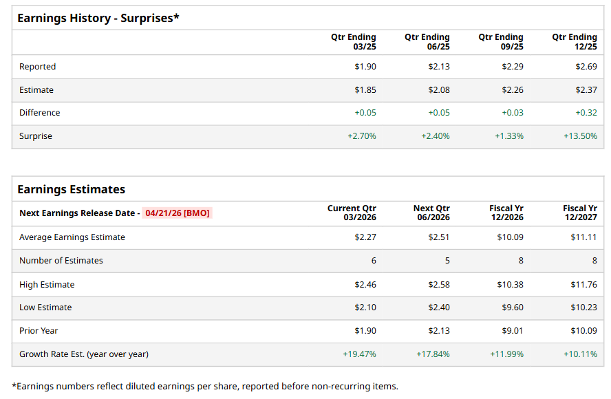 Northern Trust Corporation (NTRS), headquartered in Chicago, Illinois, offers wealth management, asset servicing, asset management, and banking solutions. Valued at $26.4 billion by market cap, the company manages approximately $1 trillion in assets under management offering investment strategies that appropriately compensate investors for risk. Its services include mutual funds, ETFs, multi-asset solutions, retirement plan solutions, and outsourced investment solutions. The market leader in wealth management services is expected to announce its fiscal first-quarter earnings for 2026 before the market opens on Tuesday, Apr. 21.