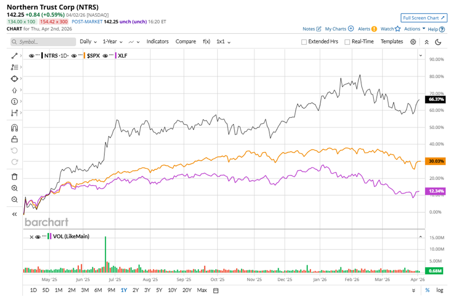NTRS stock has outperformed the S&P 500 Index’s ($SPX) 22% gains over the past 52 weeks, with shares up 44.1% during this period. Similarly, it outperformed the State Street Financial Select Sector SPDR ETF’s (XLF) 1.3% dip over the same time frame.