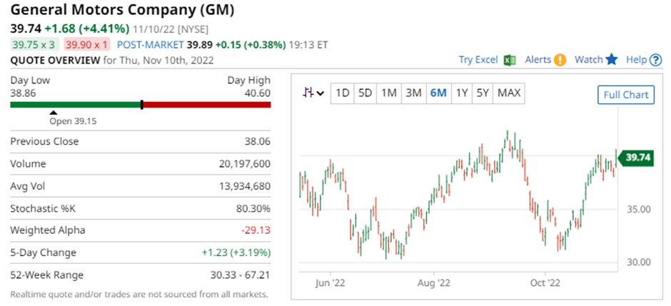 GM is showing an IV Percentile of 24% and an IV Rank of 26.97%. The current level of implied volatility is 40.81% compared to a 52-week high of 60.36% and a low of 33.59%.