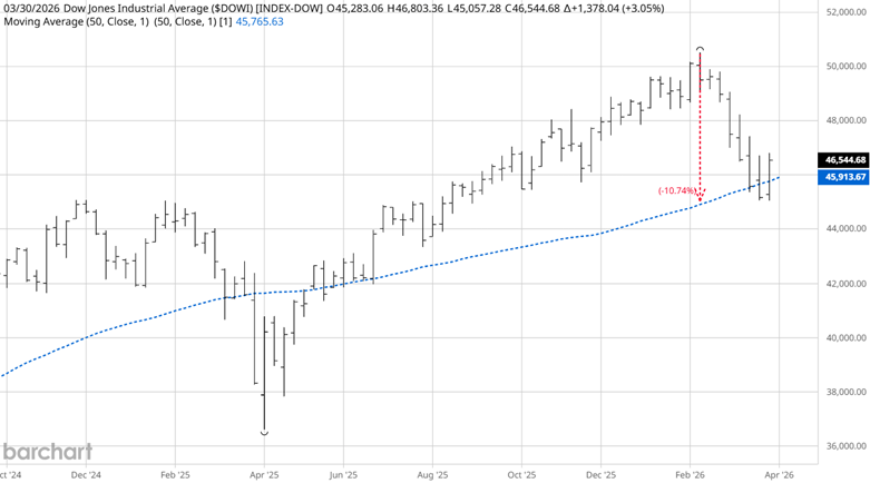 From a technical standpoint, the weekly chart of the Dow Jones Industrial Average shows a market that has recently undergone a healthy reset rather than a structural breakdown. After pulling back roughly 11% from its all-time highs, price retraced into the rising 50-week simple moving average, where buyers have begun to step back in, producing a constructive bounce and reinforcing that longer-term trend support remains intact—for now. The reaction at this level suggests institutions are still willing to defend the broader uptrend. Still, the next directional move may hinge less on pure technicals and more on external catalysts. In particular, the timing and resolution of the ongoing U.S. conflict with Iran could become a defining variable: a swift de-escalation would likely fuel risk-on momentum and confirm the support hold as a higher low, while a prolonged conflict could inject uncertainty, pressure sentiment, and potentially turn this bounce into a temporary pause before further downside.