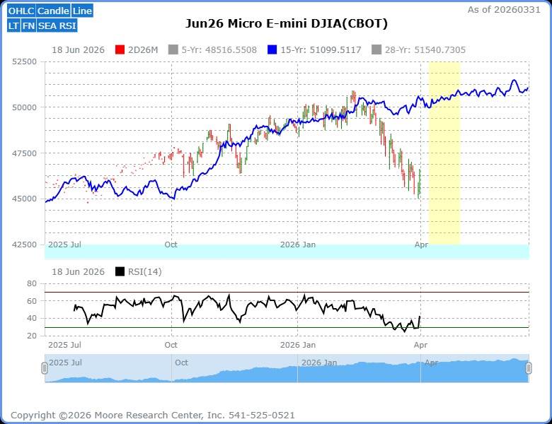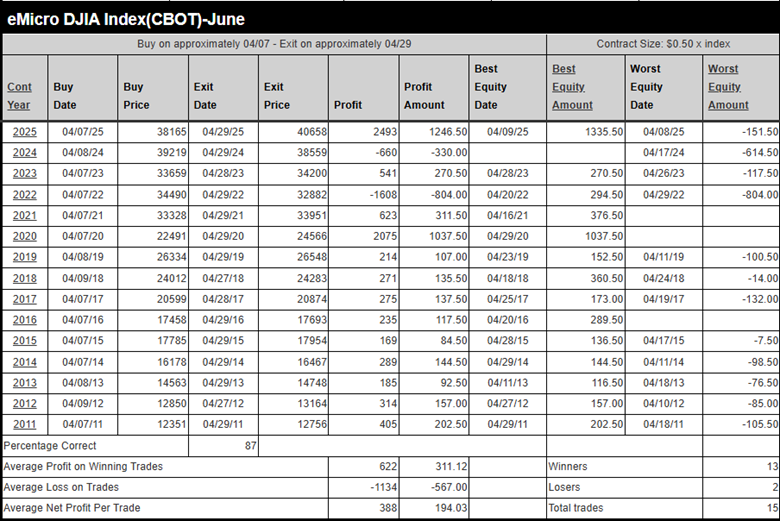 For this optimal seasonal buy window, MRCI research has revealed that the DJIA Index has closed higher on approximately April 29 than on April 07. The occurrence rate of this has been 87% over the past 13 of the past 15 years, and during the hypothetical testing of this optimal window, 3 of the years had no daily closing drawdown. The average net profit was 388 index points, or $194.03 per E-Micro DJIA Index futures contract.