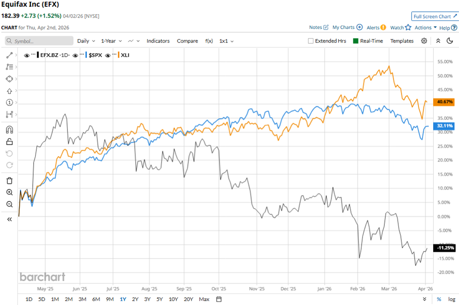 Shares of Equifax have decreased 26.3% over the past 52 weeks, lagging behind both the S&P 500 Index's ($SPX) nearly 22% gain and the State Street Industrial Select Sector SPDR ETF's (XLI) 23.1% return over the same time frame.