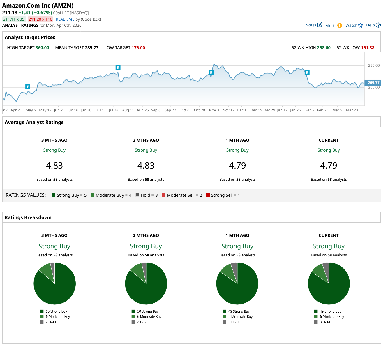 Amazon trades at a trailing P/E of 29.26, with the stock closing near $209.77 and trailing 12-month EPS at $7.17. That multiple sits well below the company's 10-year median of 80.87.