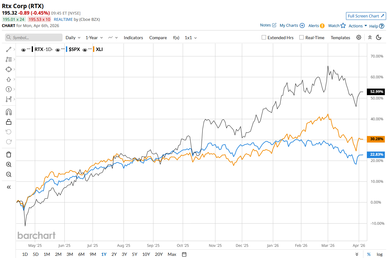 RTX stock has surged 66.7% over the past 52 weeks, outperforming the S&P 500 Index’s ($SPX) 22% rise and the State Street Industrials Select Sector SPDR ETF’s (XLI) 23.1% return during the same time frame.
