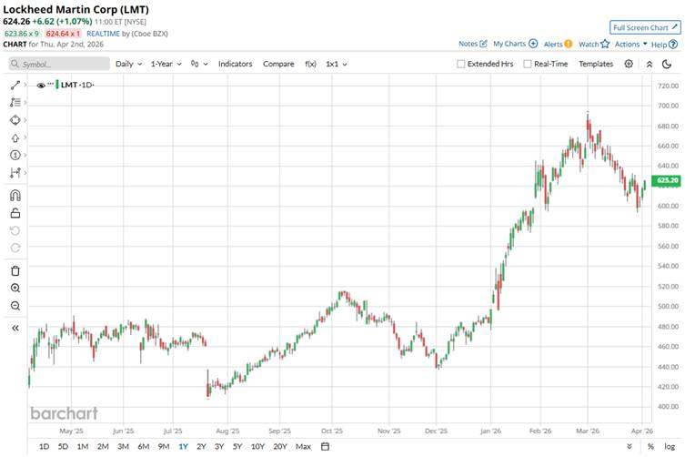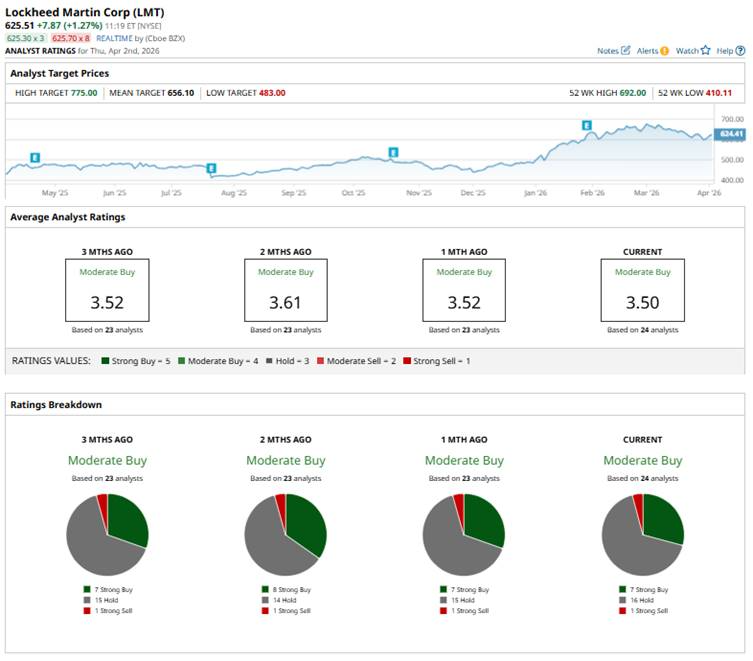 LMT stock has delivered strong outperformance versus the broader market. Over the past 52 weeks, the stock is up 37%, significantly ahead of the S&P 500 Index’s ($SPX) 22% returns over the same period. On a year-to-date (YTD) basis, LMT stock has risen 29%, compared to a 4% decline for the S&P 500, driven by geopolitical demand and defense-spending tailwinds.