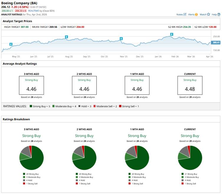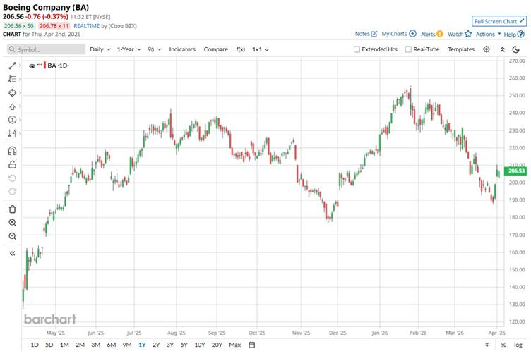 BA stock is up nearly 24% over the past 52 weeks but down around 4% YTD, outperforming the S&P 500 over the past year while slightly lagging this year. In 2026, the stock has pulled back as renewed scrutiny around quality control, production delays, and margin pressures has weighed on investor sentiment.
