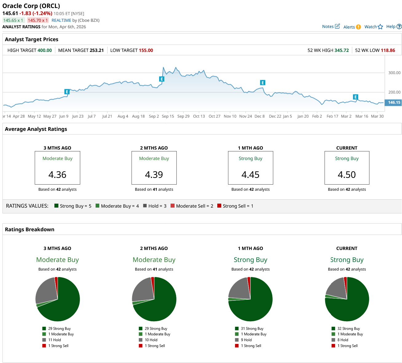 Wall Street analysts are highly optimistic about ORCL stock, as evidenced by its consensus “Strong Buy” rating. Among the 42 analysts covering the stock, 32 have a “Strong Buy” rating, one assigns a “Moderate Buy,” eight recommend holding, and one issues a “Strong Sell.” The mean price target for ORCL stock stands at $253.21, indicating a potential upside of 73% from Thursday’s closing price.