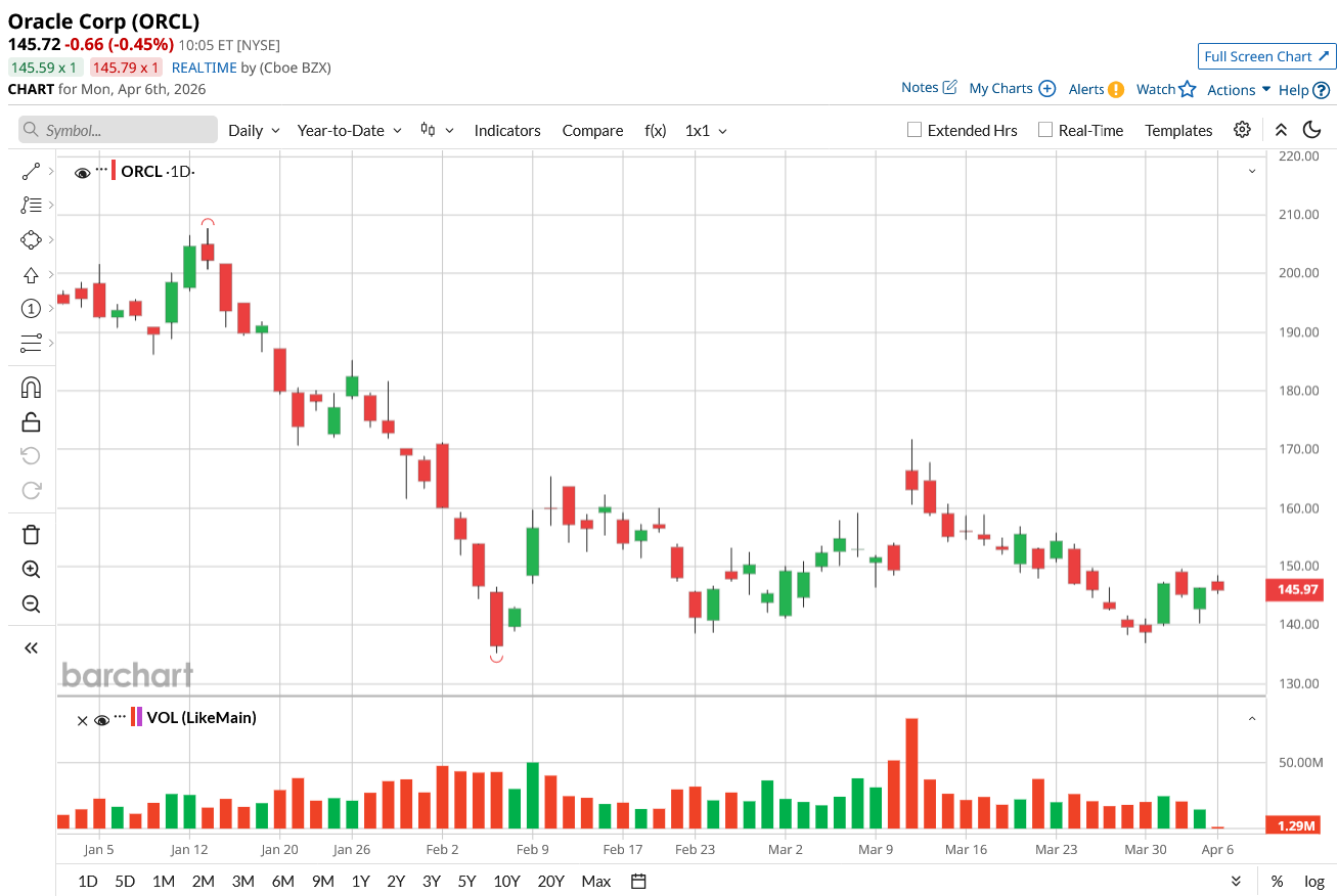 Shares of the cloud-computing and database company have slumped 24.9% on a year-to-date (YTD) basis. The drop was largely driven by investor concerns over the viability of the company’s data center financing plan. ORCL stock jumped in mid-March after the company posted robust demand for its cloud services to support AI training and deployment. However, those gains were later wiped out amid a broader market selloff tied to the war in Iran.