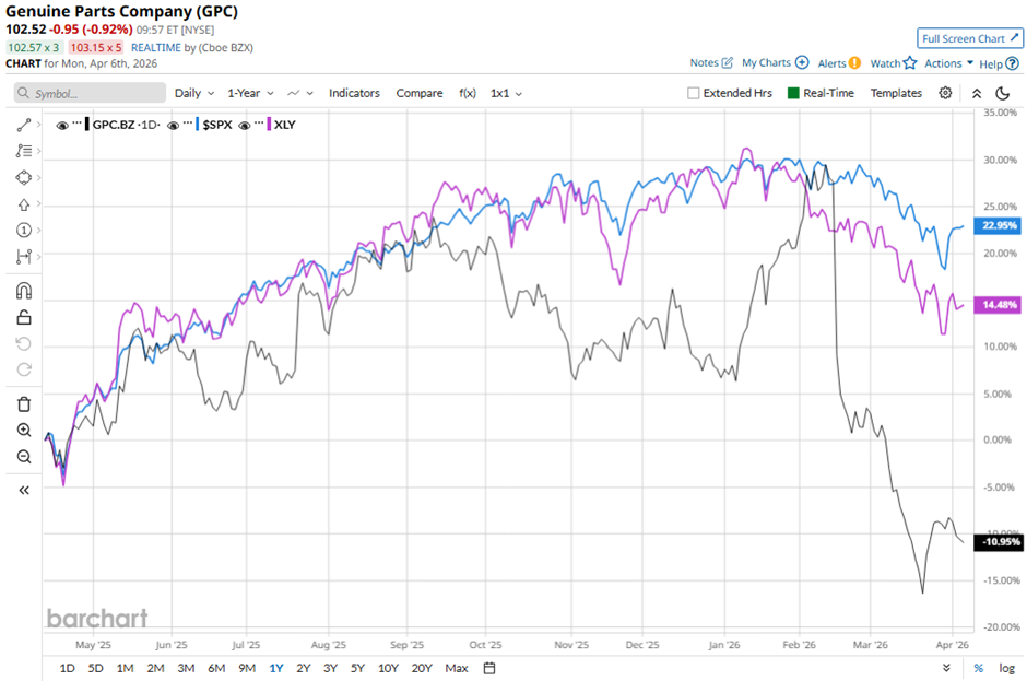Shares of Genuine Parts have declined 11.6% over the past 52 weeks, lagging behind the S&P 500 Index's ($SPX) 29.8% gain and the State Street Consumer Discretionary Select Sector SPDR ETF's (XLY) 18.7% rise over the period.