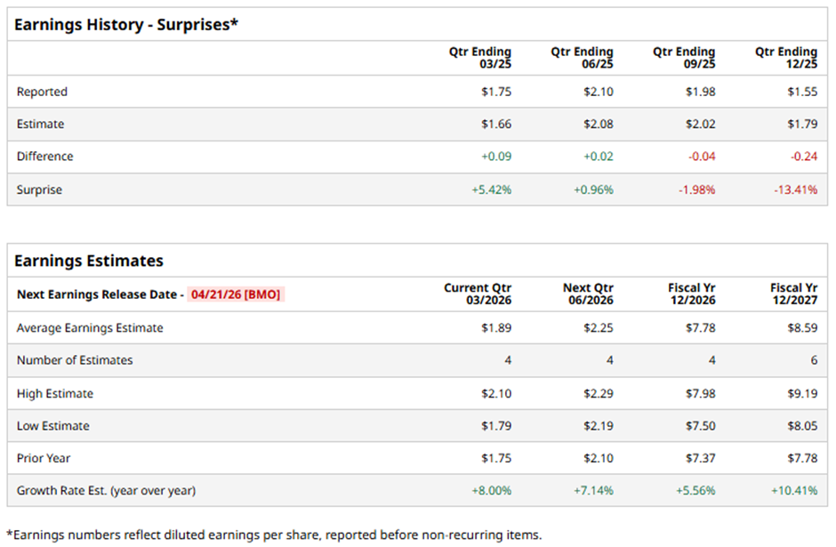 The Atlanta, Georgia-based company is set to announce its fiscal Q1 2026 results before the market opens on Tuesday, Apr. 21. Analysts predict GPC to report an adjusted EPS of $1.89, a 8% rise from $1.75 in the year-ago quarter. It has surpassed Wall Street's earnings estimates in two of the last quarters while missing on two other occasions.