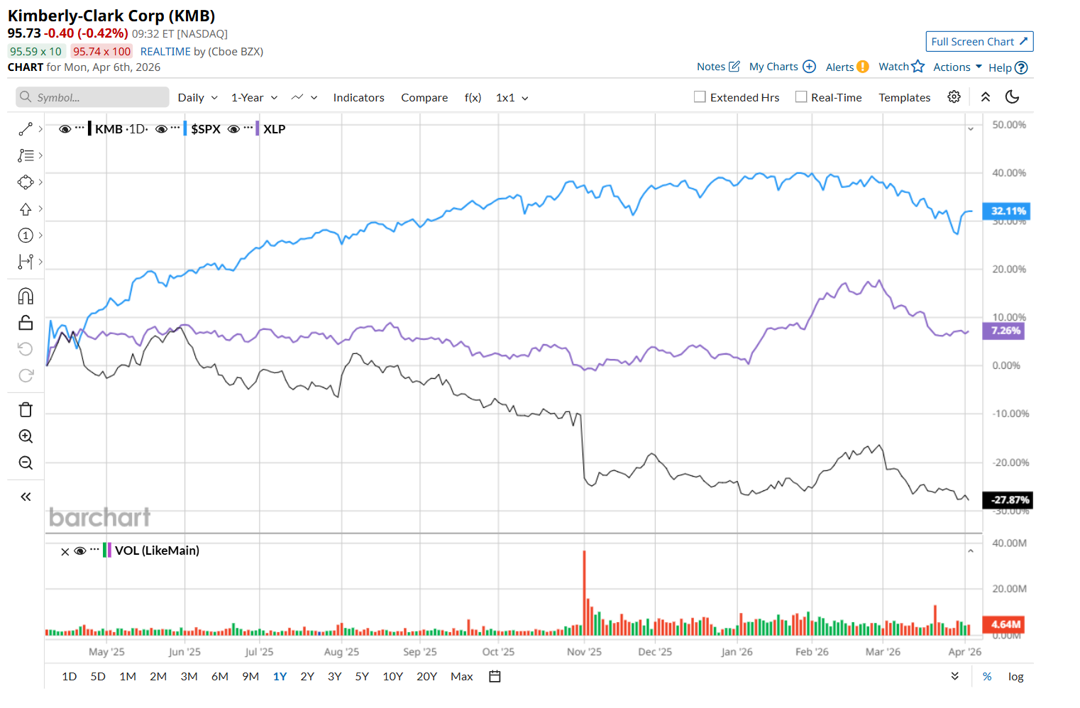 Shares of KMB have declined 30.3% over the past 52 weeks, notably underperforming both the S&P 500 Index's ($SPX) 22% return and the State Street Consumer Staples Select Sector SPDR ETF’s (XLP) 4.3% uptick over the same time period.
