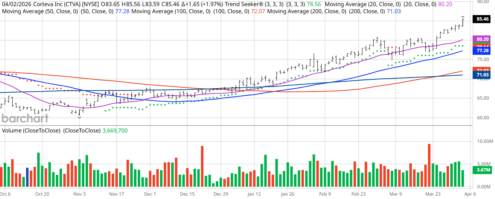 I found today’s Chart of the Day by using Barchart’s powerful screening functions to sort for stocks with the highest technical buy signals; superior current momentum in both strength and direction; and a Trend Seeker “buy” signal. I then used Barchart’s Flipcharts feature to review the charts for consistent price appreciation. CTVA checks those boxes. Since the Trend Seeker issued a new “buy” on March 9, CTVA stock is up 8.24%.