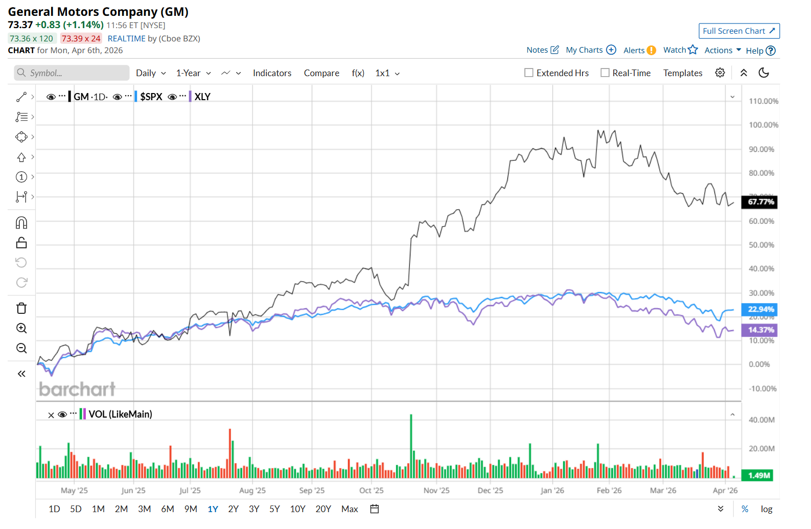 GM has rallied 65.2% over the past 52 weeks, notably outpacing both the S&P 500 Index's ($SPX) 30% return and the State Street Consumer Discretionary Select Sector SPDR ETF’s (XLY) 18.9% uptick over the same time period.