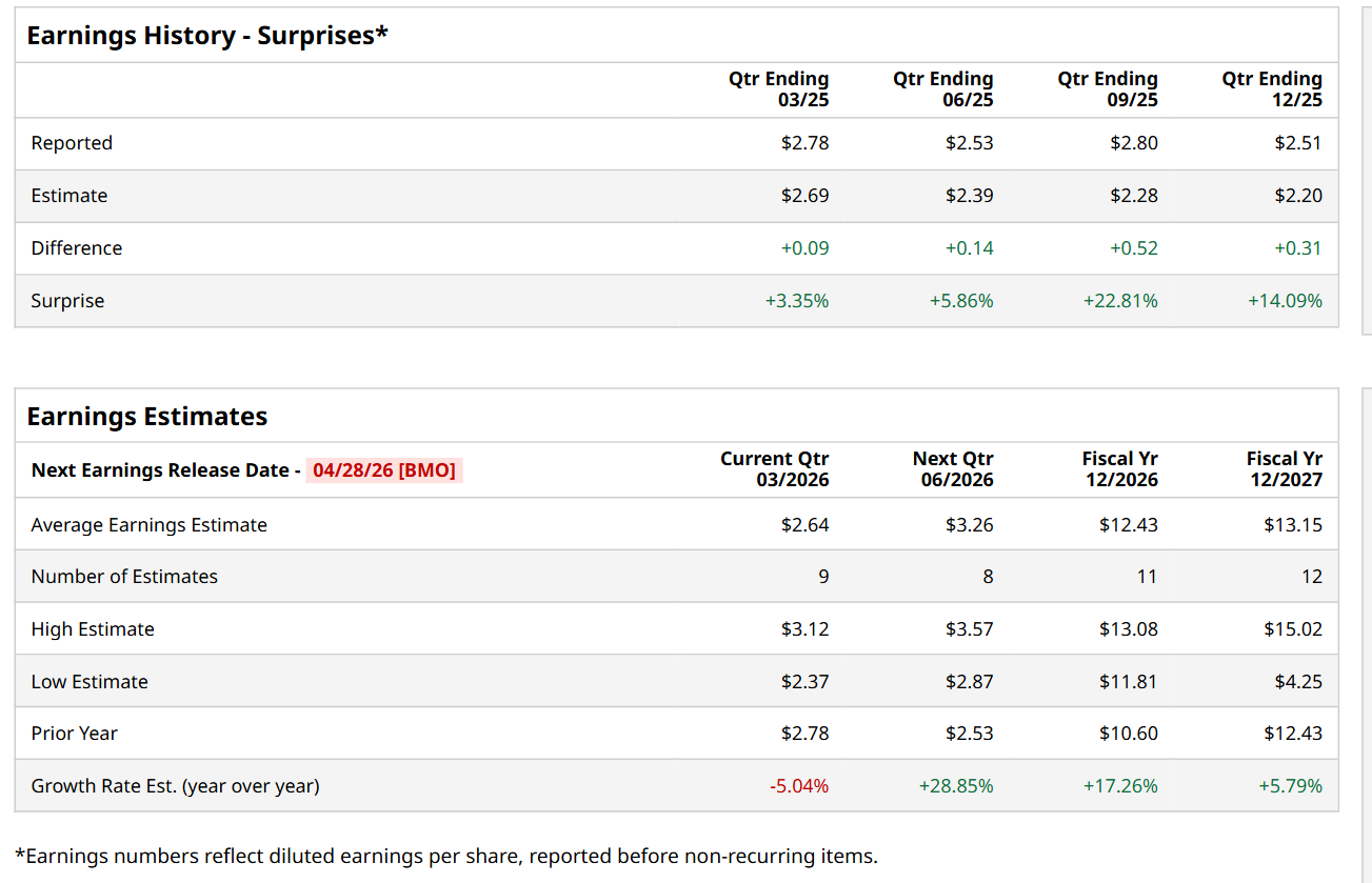 Ahead of this event, analysts expect this auto manufacturer to report a profit of $2.64 per share, down 5% from $2.78 per share in the year-ago quarter. The company has topped Wall Street’s earnings estimates in each of the last four quarters. In Q4 2025, GM’s EPS of $2.51 outpaced the consensus estimates by a notable margin of 14.1%.