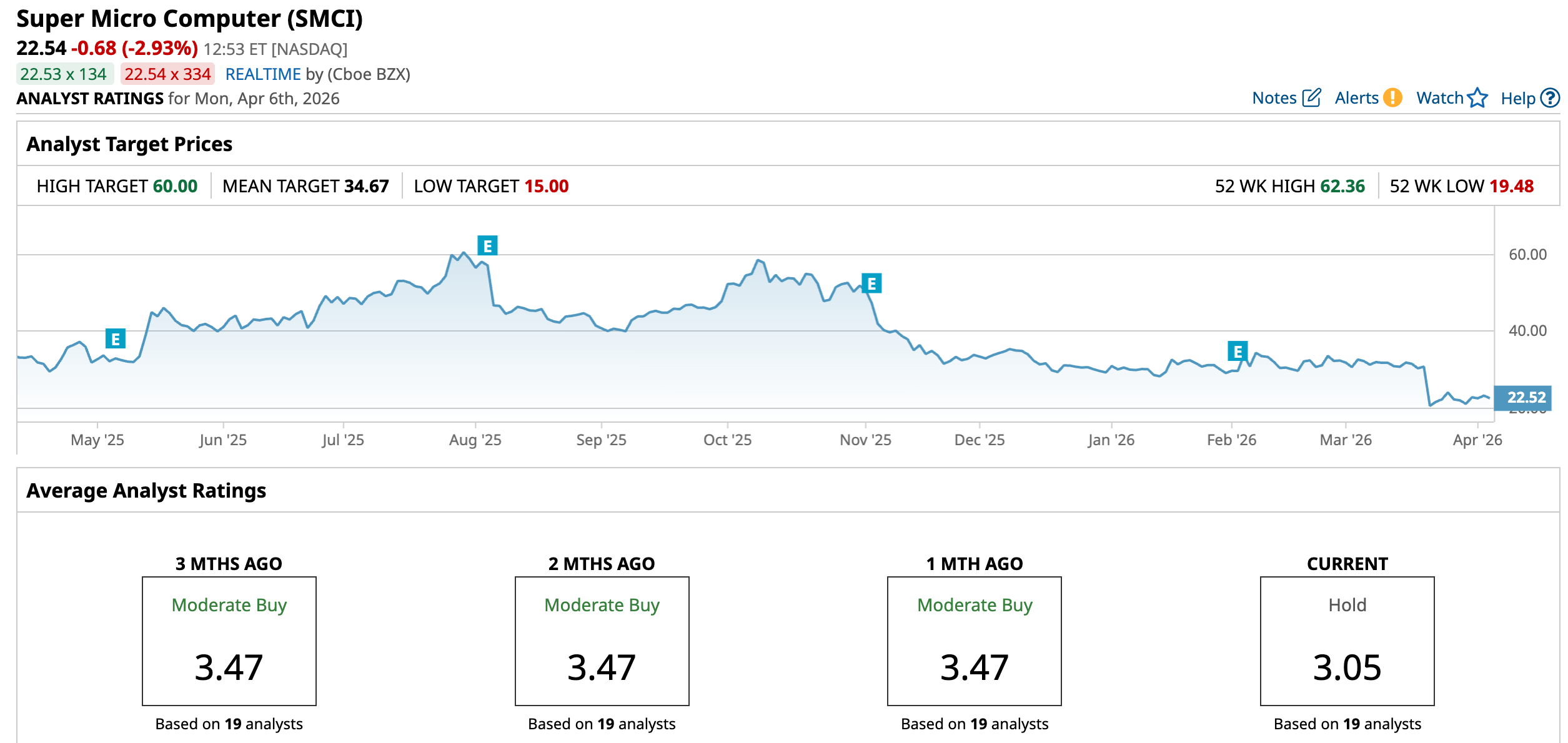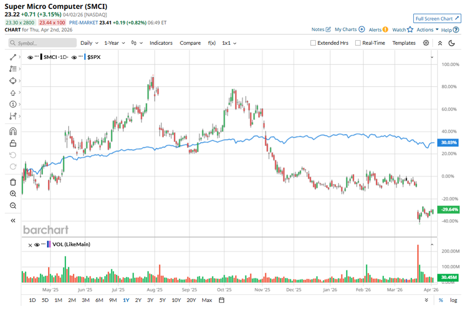 However, despite its strong positioning in the server market, Super Micro shares have been on a brutal downward slide. The stock has plunged as much as 63% from its 52-week peak of $62.36 reached last July, a sharp fall from grace for a former AI high-flyer. Over the past year alone, the stock is down 24.4%, and the pain has continued into 2026, with shares sinking another 23%. In stark contrast, the broader S&P 500 Index ($SPX) has delivered a 30% gain over the past year and is down just 3.6% in 2026.