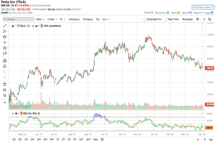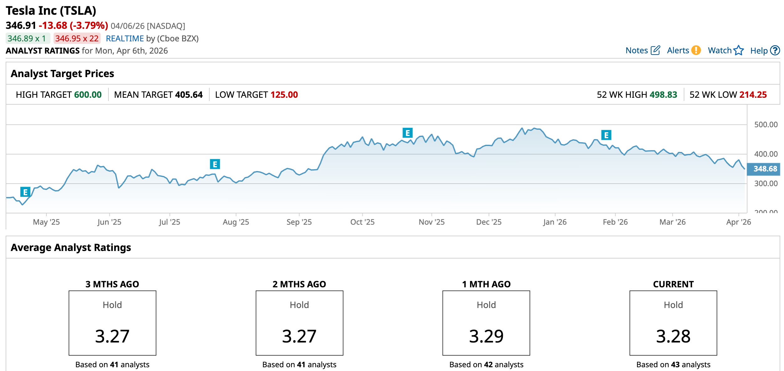 The company’s stock reached an all-time intraday high of $498.83 in December 2025, but it is down 30% from that level. Although down from its historic highs, the stock has gained 46.74% over the past 52 weeks. However, Tesla has recently been hit by a barrage of headwinds, including increased competition and reduced EV tax credits, which have led to a selloff. The company’s stock is down 21.87% year-to-date (YTD).