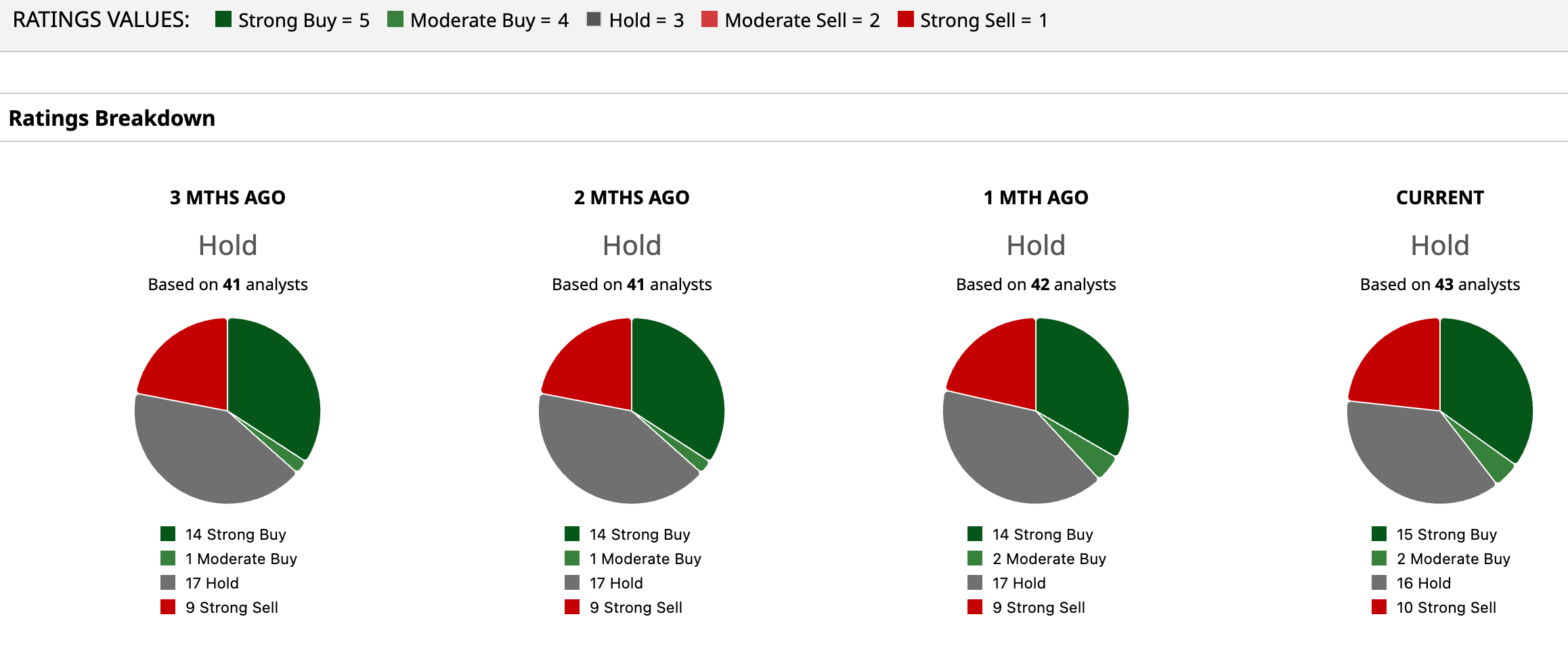 Wall Street analysts are taking a cautious stance on Tesla’s stock now, with a consensus “Hold” rating overall. Of the 43 analysts rating the stock, 15 analysts gave a “Strong Buy” rating, two analysts gave a “Moderate Buy” rating, while 16 analysts are playing it safe with a “Hold” rating, and 10 analysts gave a “Strong Sell” rating. The consensus price target of $405.64 represents a 16.9% upside from current levels. Moreover, the Street-high price target of $600 indicates a 73% upside from current levels.