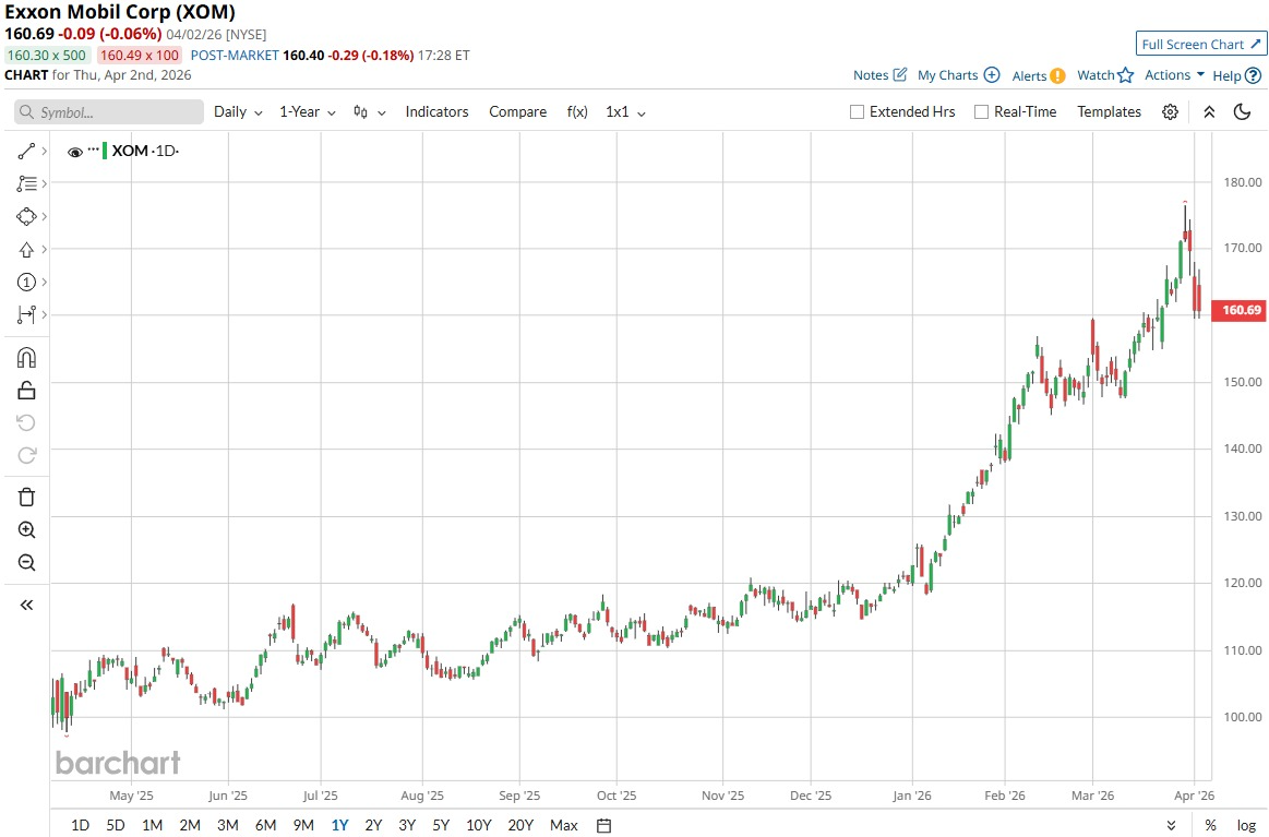 Exxon Mobil has emerged as one of the clearest beneficiaries. XOM stock has powered higher by more than 34% year-to-date (YTD). Yet the markets shifted abruptly on April 1 due to reports of the war possibly ending soon. XOM stock plunged 5%, its worst single-day drop in over a year.