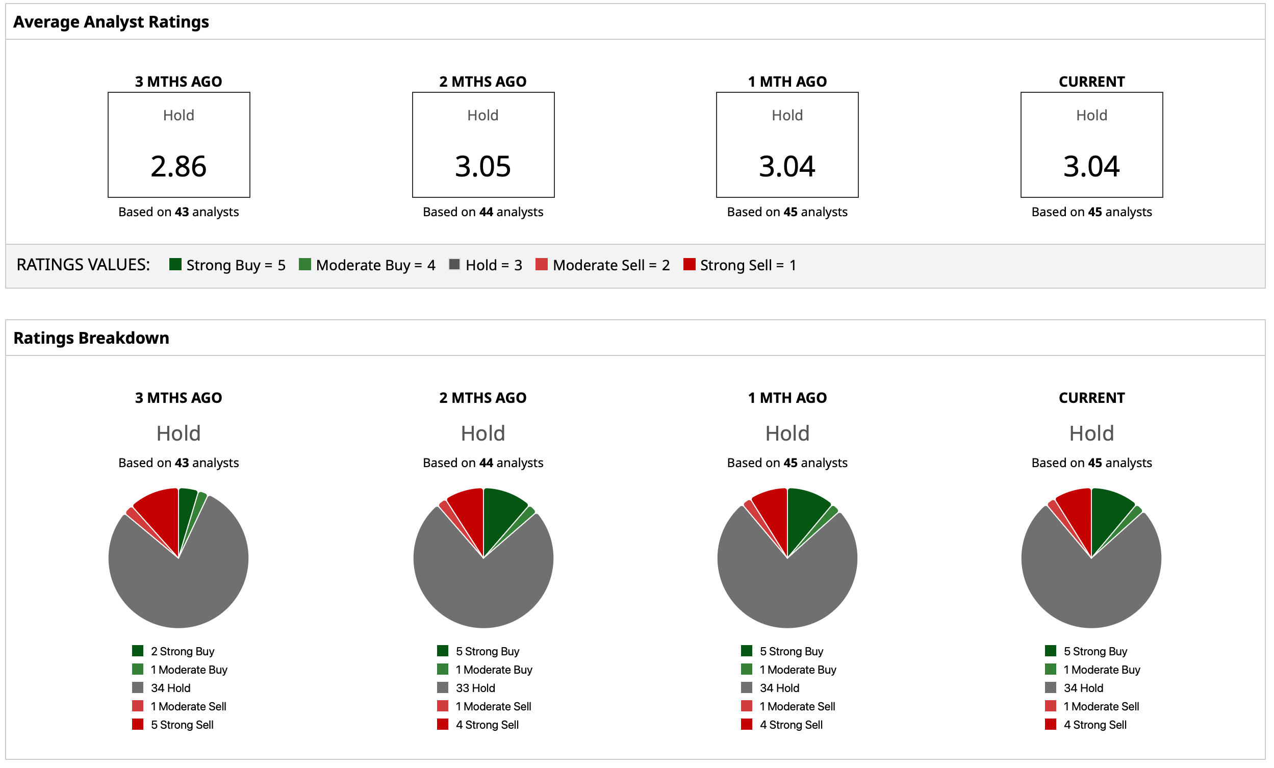 Overall, analysts continue to rate the stock a consensus “Hold.” The mean target price has already been surpassed, while the high target price of $66 indicates an upside potential of about 31% from current levels. Out of 45 analysts covering the stock, five have a “Strong Buy” rating, one has a “Moderate Buy” rating, 34 have a “Hold” rating, one has a “Moderate Sell” rating, and four have a “Strong Sell” rating.