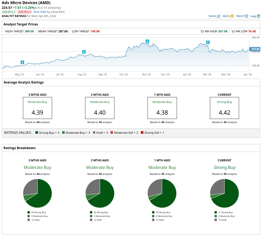 Wall Street analysts are optimistic about AMD stock and project notable upside over the next 12 months. AMD stock currently has a “Strong Buy” consensus rating among analysts, reflecting confidence in its growth prospects. Moreover, based on the average price target of $287.68, AMD shares could rise by approximately 28% over the next year.