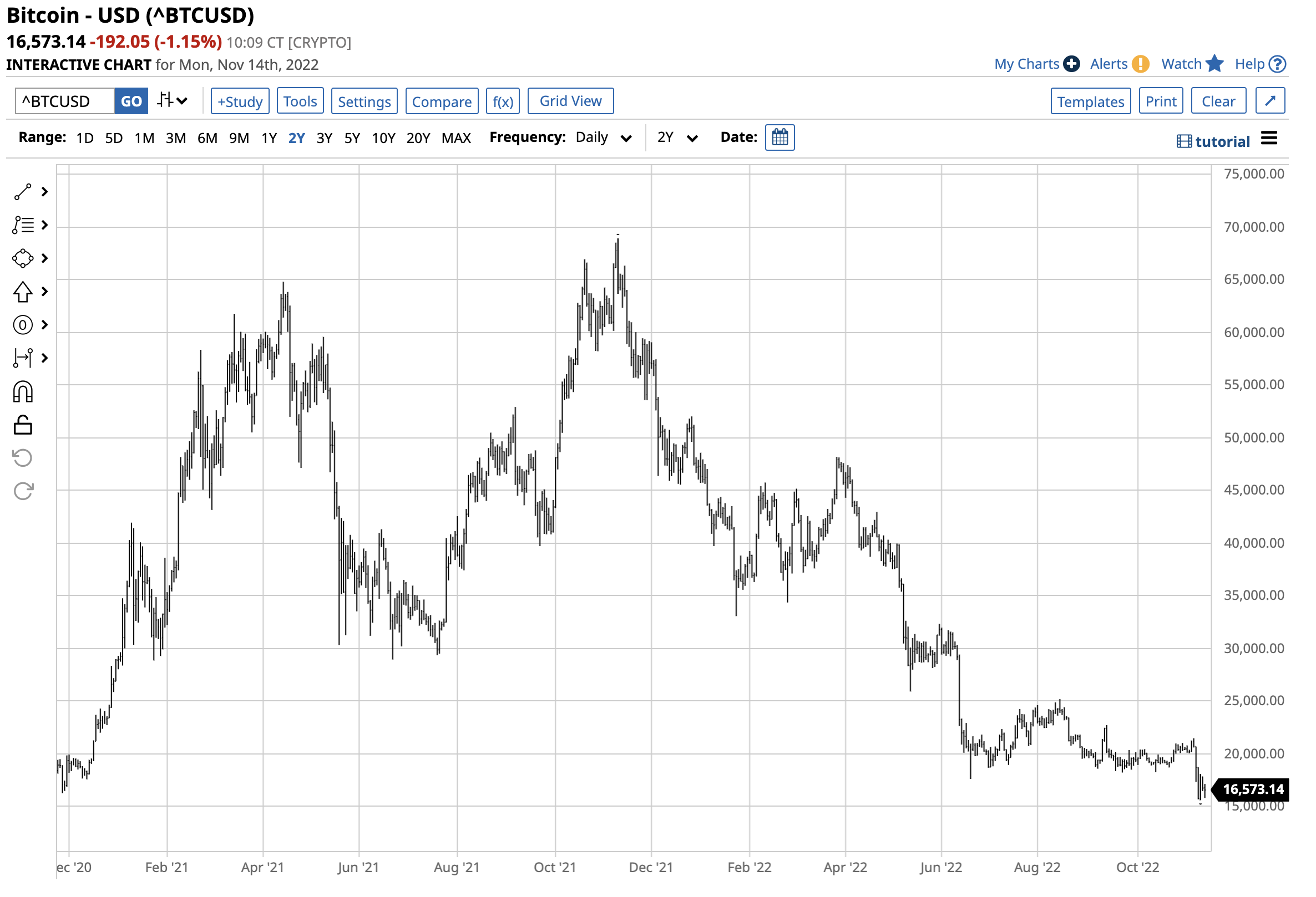 The chart shows after a recovery to $21,466.76 on November 7, Bitcoin plunged to below $16,000 and was sitting at just under the $16,600 level on November 14.