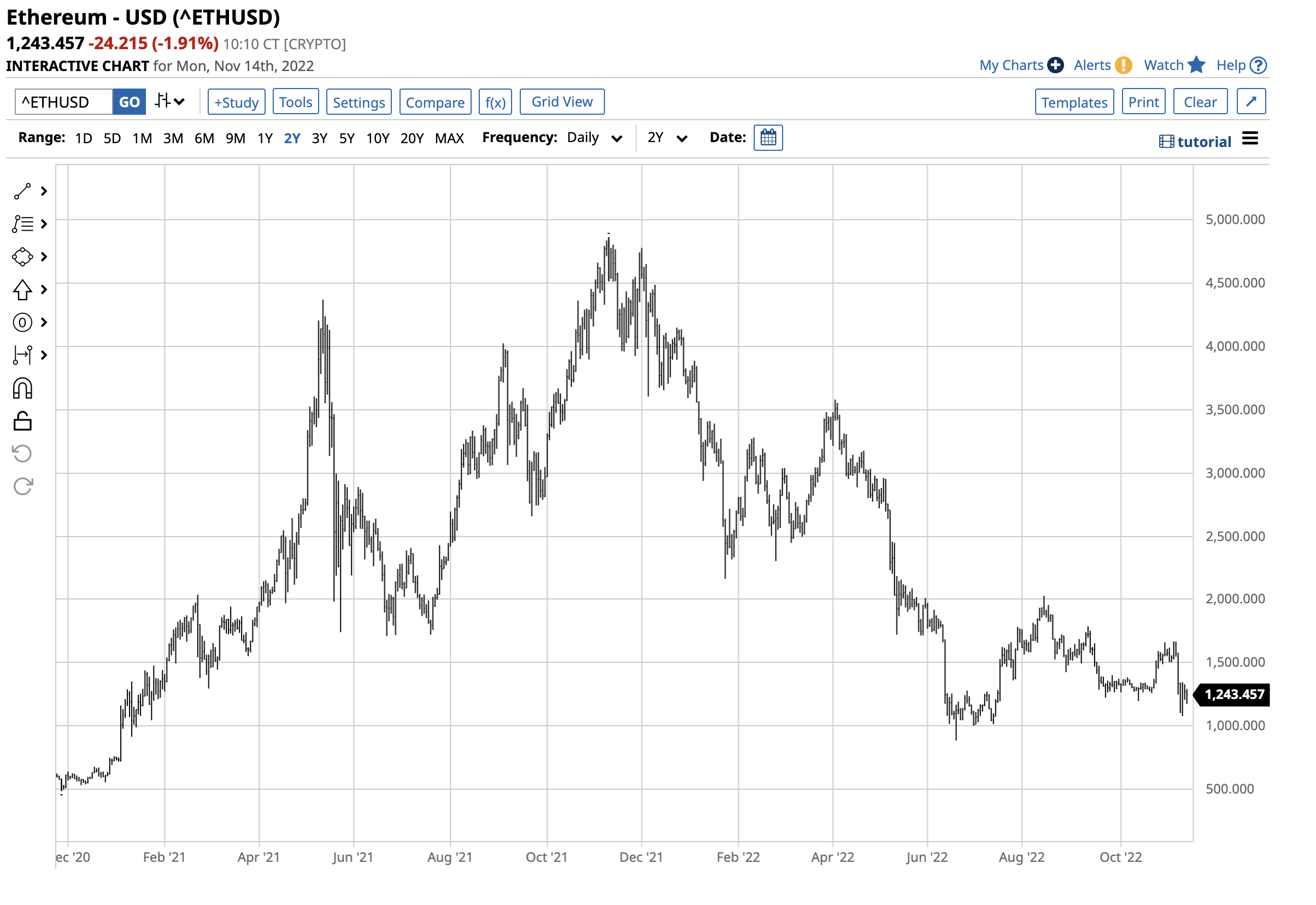 Ethereum, the second-leading crypto, fell from $1,664.707 on November 7 to below $1,100 and was at the $1,245 level on November 14.