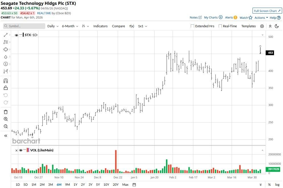 Seagate Technology (STX) shares are extending gains on April 6 after Morgan Stanley said the data storage giant has replaced peer Western Digital (WDC) as its "top pick."