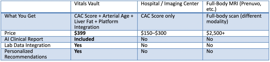 A standalone hospital CAC scan provides a single number with minimal interpretation. The Complete Metabolic Heart Scan delivers three reports, integration with the customer's biomarker data, and a clinical context layer that standalone imaging cannot replicate — at a comparable price point.