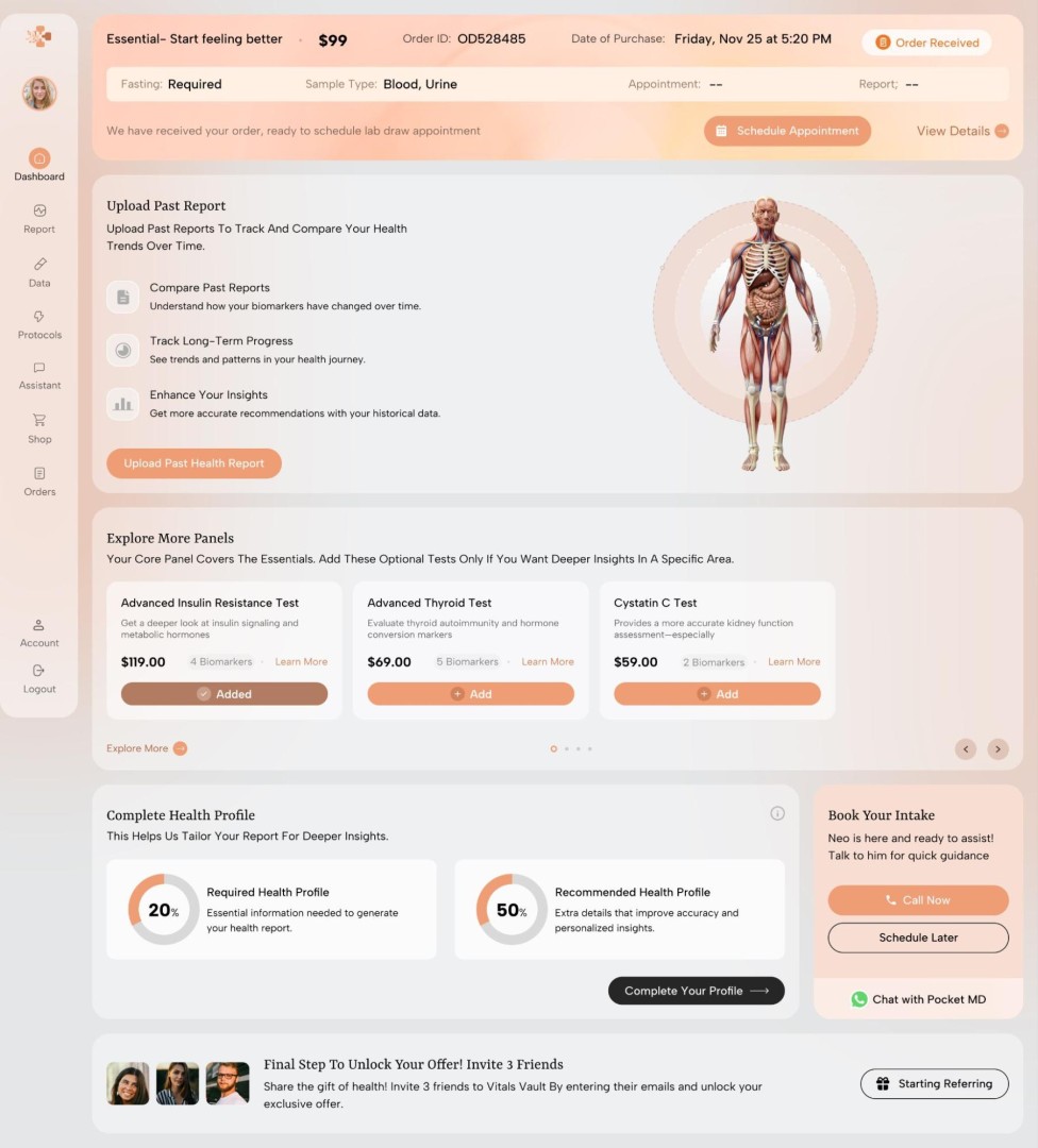 - 90-page AI Clinical Reports with functional optimal ranges and personalized action plans