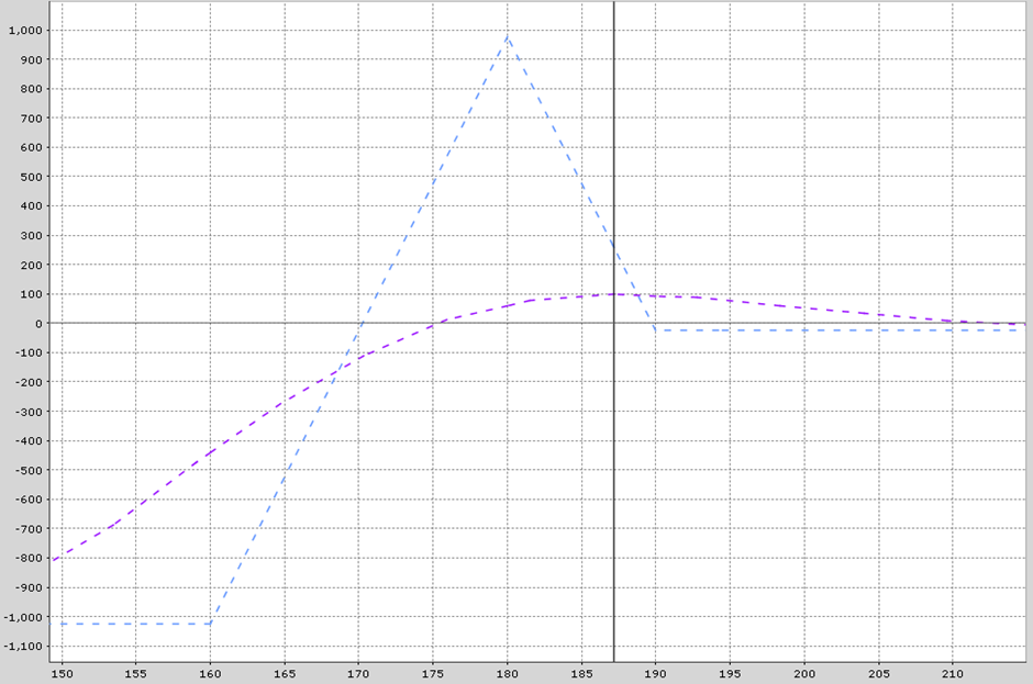 You can see the main risk in the trade is a drop in price early on. The blue line is the profit and loss at expiration and the purple line is the T+0 line. T+0 just means “today”.