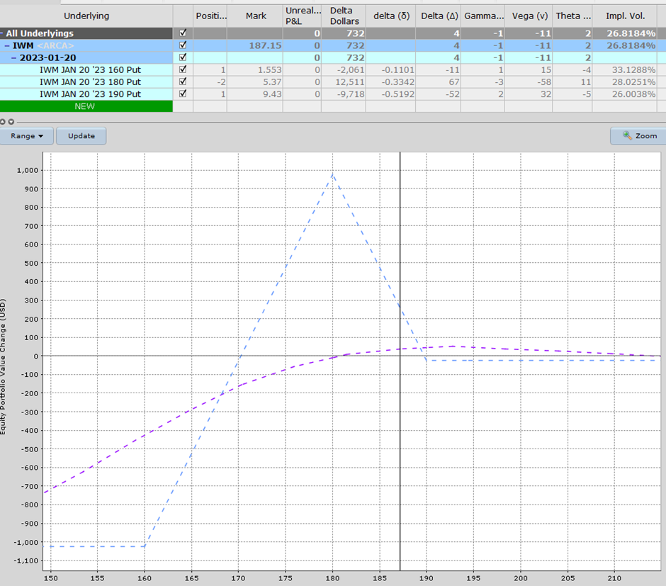 On IWM, a January expiry broken wing butterfly could be set up through buying the 160 put, selling two of the 180 puts and buying the 190 put.