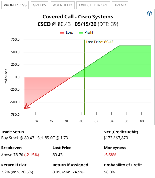 Buying 100 shares of CSCO would cost $8,043. The May 15th $85-strike call option was trading yesterday for around $1.73, generating $173 in premium per contract for covered call sellers.