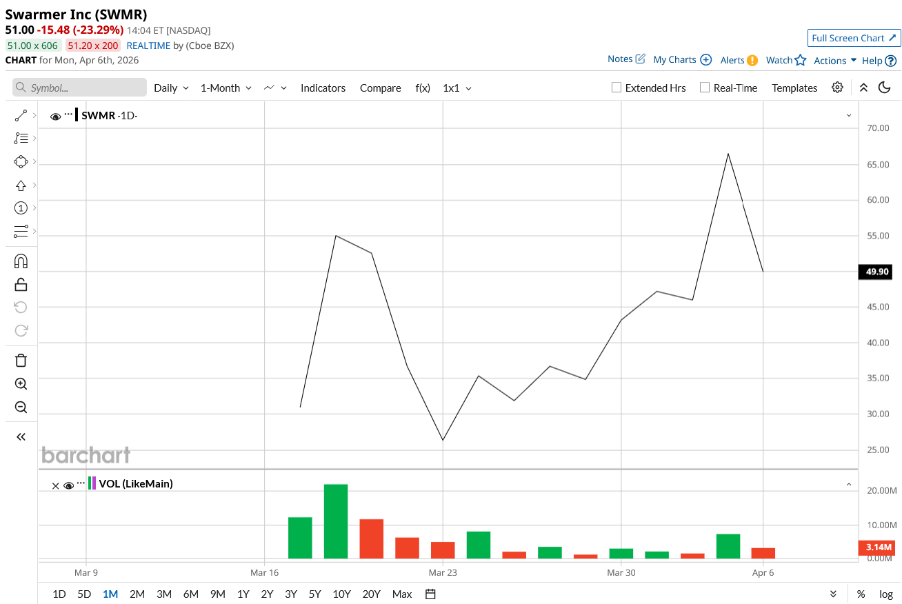 Swarmer began trading on the Nasdaq on March 17 under ticker SWMR, selling 3.45 million shares—including the underwriters' full option—and raising $14.7 million in net proceeds. Trading, though, opened at $12.50, a 150% premium, then climbed to a close of $31.00, up 520%. The stock hit an intraday high of $65.04 shortly after, and by last Thursday's close, SWMR sat at $66.48. That works out to a 1,229.6% gain since pricing, making Swarmer the best-performing U.S. stock over the period. Its market cap swelled to roughly $821 million with about 12.35 million shares outstanding.