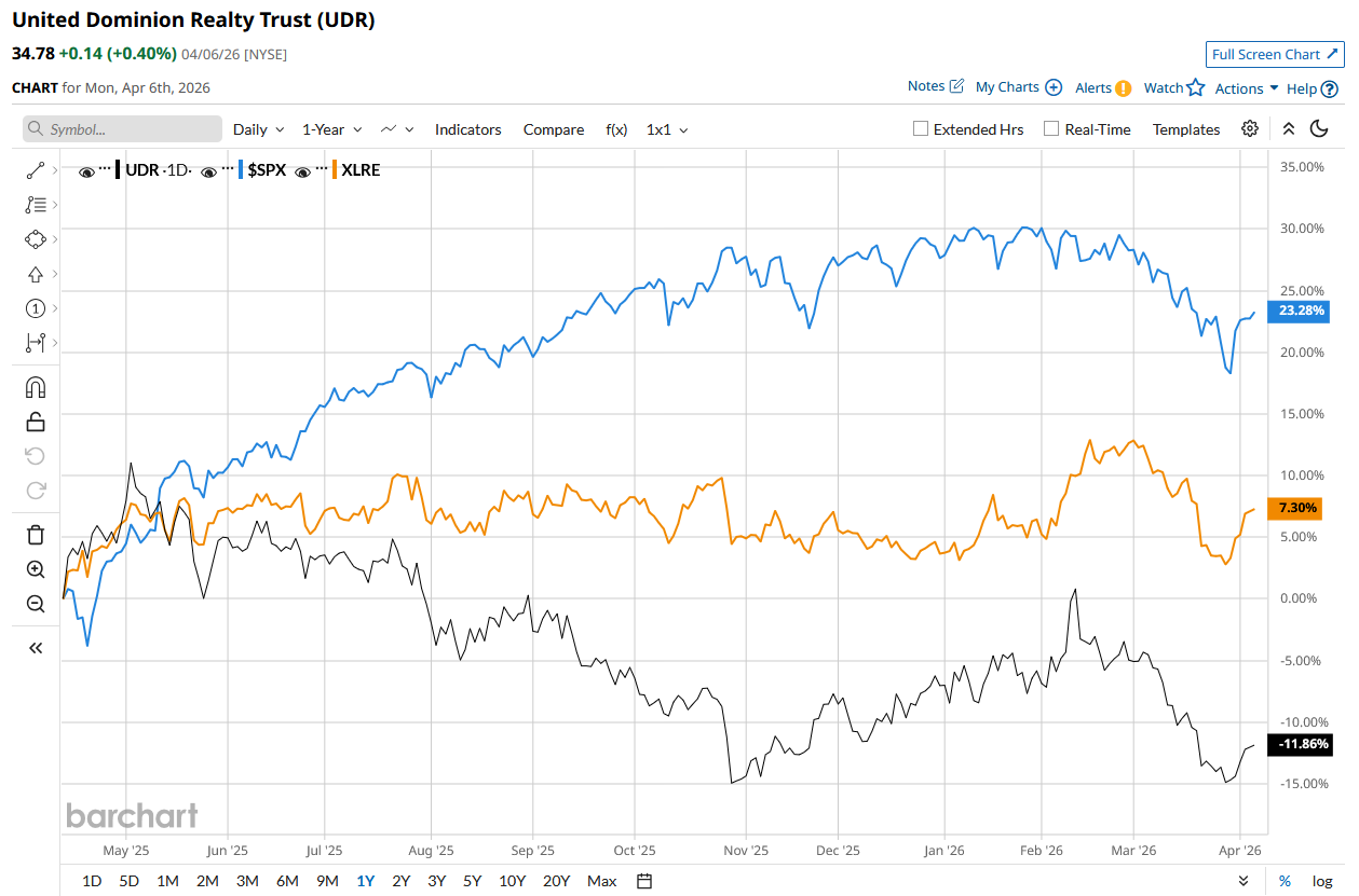 UDR stock has declined 14% over the past 52 weeks, lagging behind the S&P 500 Index’s ($SPX) 30.3% rise and the State Street Real Estate Select Sector SPDR ETF’s (XLRE) 7.2% rise during the same time frame.
