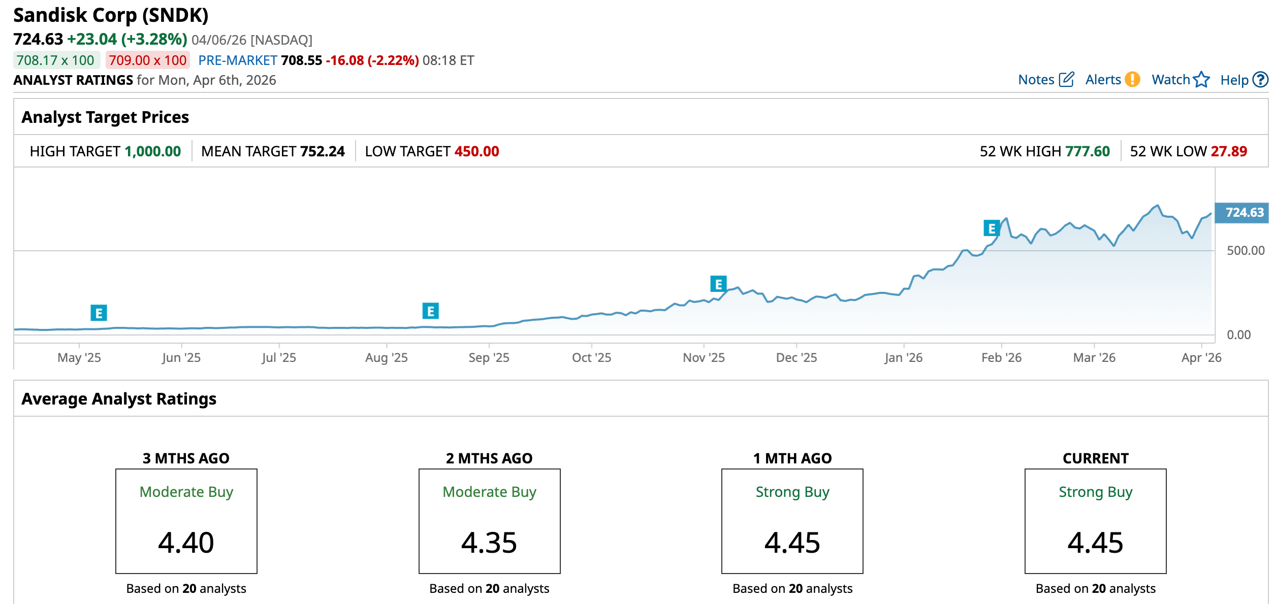 After the recent recovery in stock price, SanDisk stock is closing in on its mean target price of $752.24, as per estimates from 20 different analysts. This suggests the valuation discount is narrowing and the market may well be waking up to the scenario Mizuho and other analysts have pointed to. In the last two weeks, three different analysts have assigned price targets of $875, $900, and $1000, which suggests the sentiment may be turning bullish again.