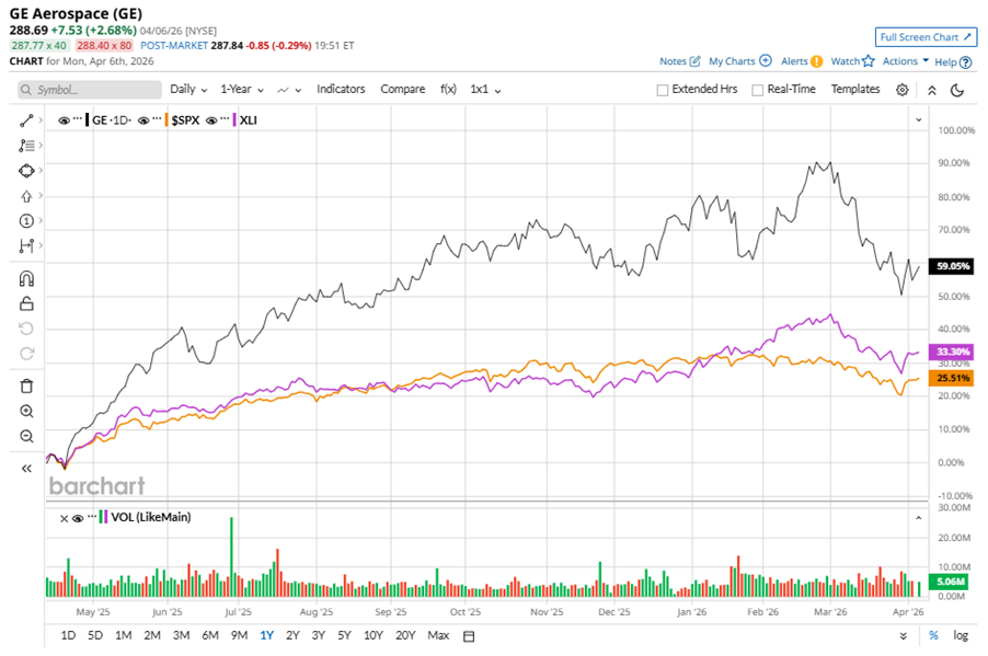 GE stock has outperformed the S&P 500 Index’s ($SPX) 30.3% gains over the past 52 weeks, with shares up 73.1% during this period. Similarly, it outperformed the State Street Industrial Select Sector SPDR ETF’s (XLI) 39.6% gains over the same time frame.